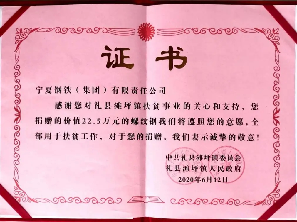 寧夏鋼鐵集團(tuán)是寧夏自治區(qū)內(nèi)最大、裝備水平最高、集焊接材料、鋼筋智能制造、區(qū)域物流、房地產(chǎn)開發(fā)等多元產(chǎn)業(yè)并舉的跨行業(yè)、現(xiàn)代化鋼鐵聯(lián)合企業(yè)。企業(yè)發(fā)展的宗旨是“為更多的人創(chuàng)造更多的幸福”,特成立“幸福寧鋼基金”從大病救助、教育助學(xué)、貧困幫扶、社會(huì)捐助四個(gè)方面造福桑梓,同時(shí)積極主動(dòng)履行社會(huì)責(zé)任,在圓夢行動(dòng)、抗疫救災(zāi)、農(nóng)民工就業(yè)等方面奉獻(xiàn)力量,尤其助力脫貧攻堅(jiān)行動(dòng),幫扶貧困村脫貧,和貧困村結(jié)成幫扶對子,一對一的幫扶,真正實(shí)現(xiàn)“在小康的路上,一個(gè)也不能掉隊(duì)”,被評為寧夏自治區(qū)慈善企業(yè)、關(guān)愛農(nóng)民工優(yōu)秀企業(yè)等。